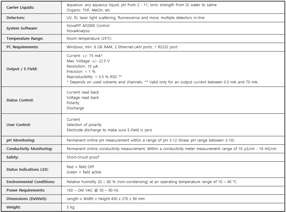 새로운 Postnova EAF2000은 PN2410 EFF 컨트롤러, EAF4 채널 및 해당 소프트웨어인 표준 AF2000 비대칭 흐름 FFF와 비교하여 세 가지 다른 구성 요소로 구성됩니다. 이러한 하드웨어 및 소프트웨어 모듈은 기존의 모든 AF2000 시스템에 쉽게 추가할 수 있으며, 전 세계 연구소에서 이미 실행 중인 다양한 AF2000 시스템 중 어느 것이든 더욱 강력한 기능을 제공합니다.
